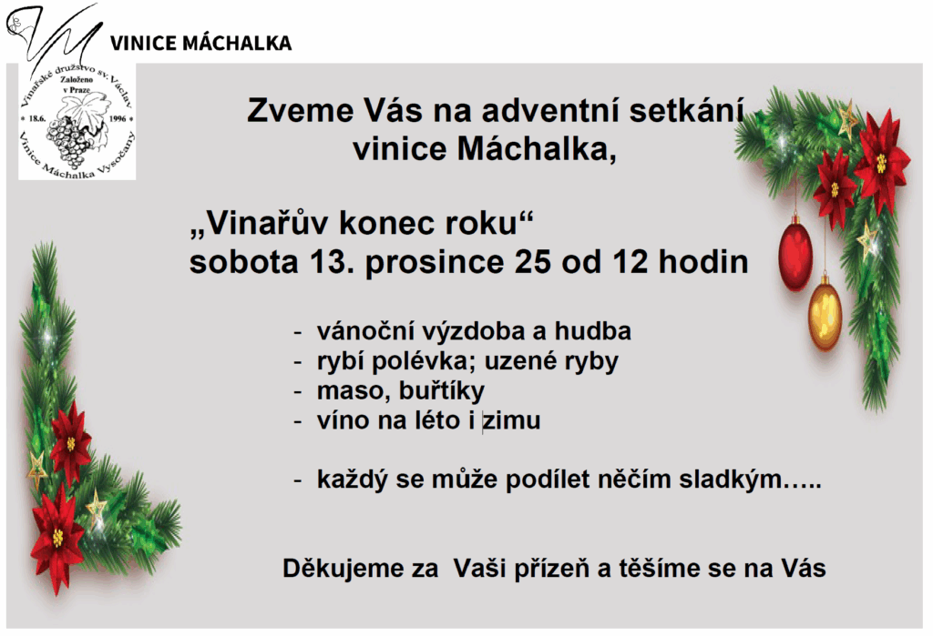 Zveme vás na adventní setkání vinice Máchalka, neboli „Vinařův konec roku“. Můžete se těšit na vánoční výzdobu a hudbu, rybí polévku, uzené ryby, pečené maso a buřtíky a také víno […]